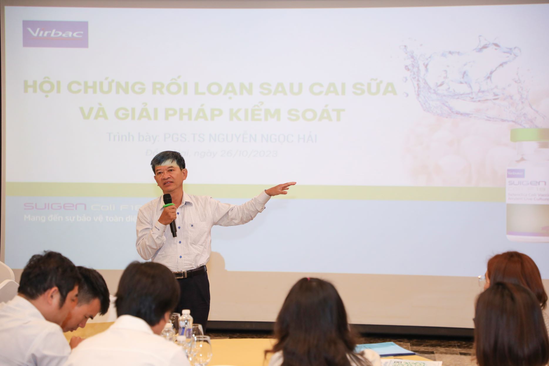 Hiện nay, chăn nuôi heo được xem là một trong những ngành nghề đang gặp nhiều khó khăn từ việc trang trại cần phải kiểm soát nhiều loại dịch bệnh và cải thiện năng suất để đảm bảo được lợi nhuận ổn định nhất. Ngoài ra yêu cầu cần phải tuân thủ quy định của chính phủ từ năm 2020 về việc hạn chế sử dụng kháng sinh trong thức ăn nên chúng ta dễ dàng nhận thấy sự xuất hiện trở lại của những căn bệnh phổ thông trước đây như liên cầu khuẩn, E.coli hay M.suis làm cho mối lo ngại của các nhà chăn nuôi càng gia tăng. Một trong những áp lực mà các nhà chăn nuôi luôn gặp phải là ảnh hưởng khá nặng nề trong giai đoạn khủng hoảng của heo con khi cai sữa. Bởi vì ở giai đoạn này heo con gặp quá nhiều stress đến từ môi trường chăn nuôi, điều kiện khí hậu chuồng trại, tự lập về dinh dưỡng cũng như những rối loạn liên quan đến việc sụt giảm miễn dịch. Mặc dù khoảng thời gian này chỉ kéo dài từ 01 đến 04 tuần nhưng có ảnh hưởng rất lớn về mặt năng suất tăng trưởng và tỷ lệ sống sót ở giai đoạn sau cai sữa. Hiểu được vấn đề trên, ngày 26/10/2023 vừa qua, Virbac đã tổ chức hội thảo về chuyên đề "KHỦNG HOẢNG SAU CAI SỮA VÀ GIẢI PHÁP" với sự tham gia của hơn 80 khách mời đến từ các công ty chăn nuôi, trang trại và đại lý.